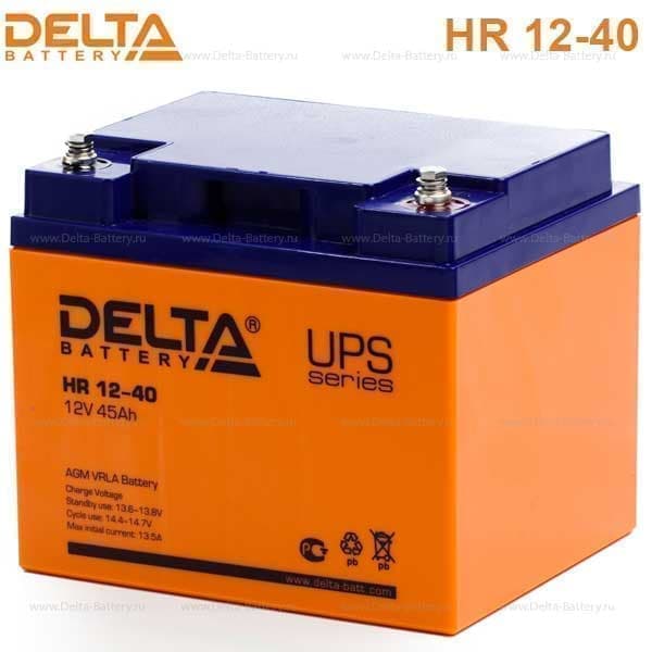 Герметизированный VRLA cвинцово-кислотный аккумулятор Delta HR 12-40 напряжением 12В и емкостью 45Ач изготовлен по технологии AGM (с микропористым заполнителем, пропитанным электролитом). Корпус изготовлен из негорючего ABS пластика. Срок службы аккумулятора достигает 10-12 лет. Аккумулятор относится к линейке DELTA UPS series и предназначен для работы в системах бесперебойного питания (ИБП), системах связи, ЦОД. Обладает низким внутренним сопротивлением и высокой плотностью энергии. Дополнительно к аккумулятору у нас можно подобрать зарядное устройство для него, батарейный шкаф или стеллаж.