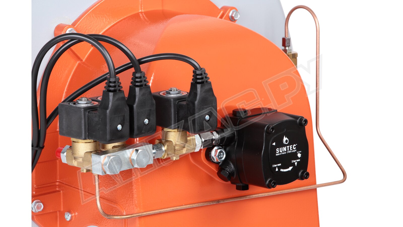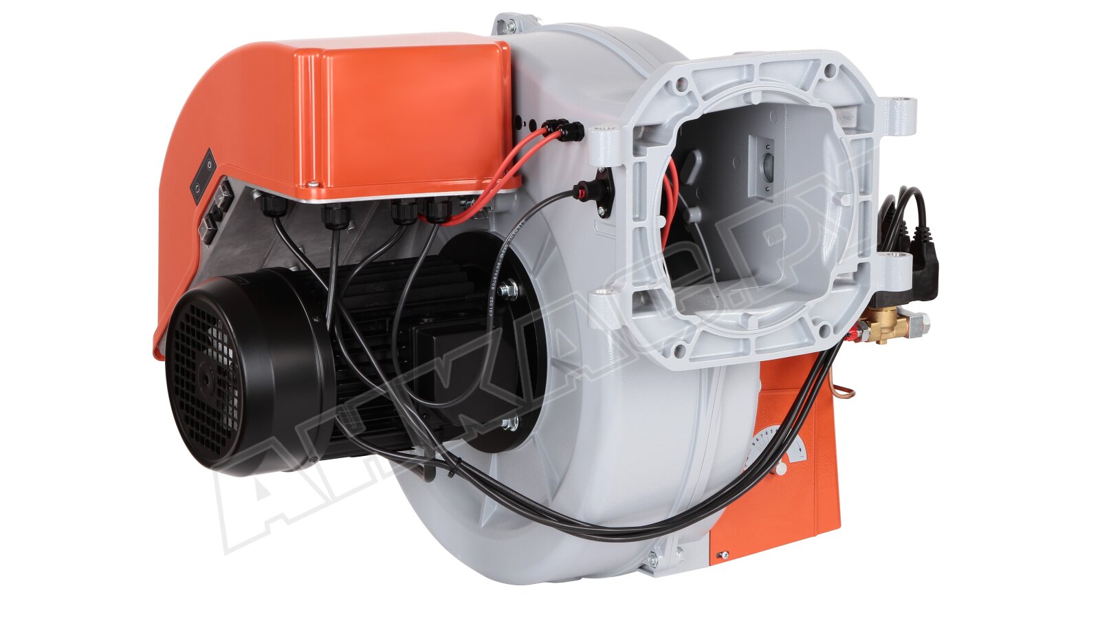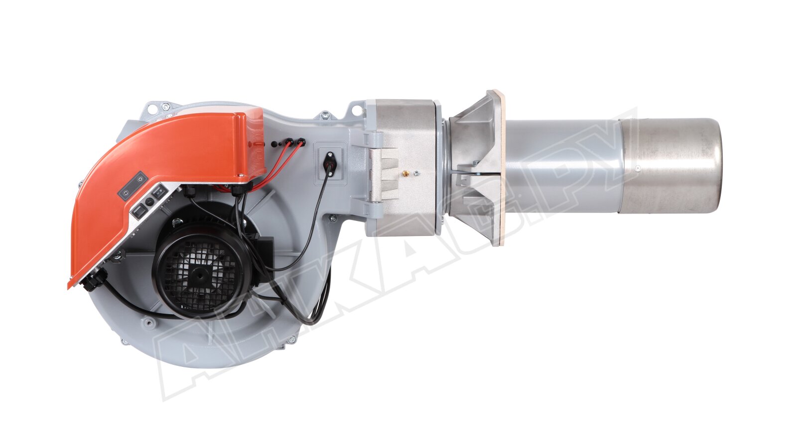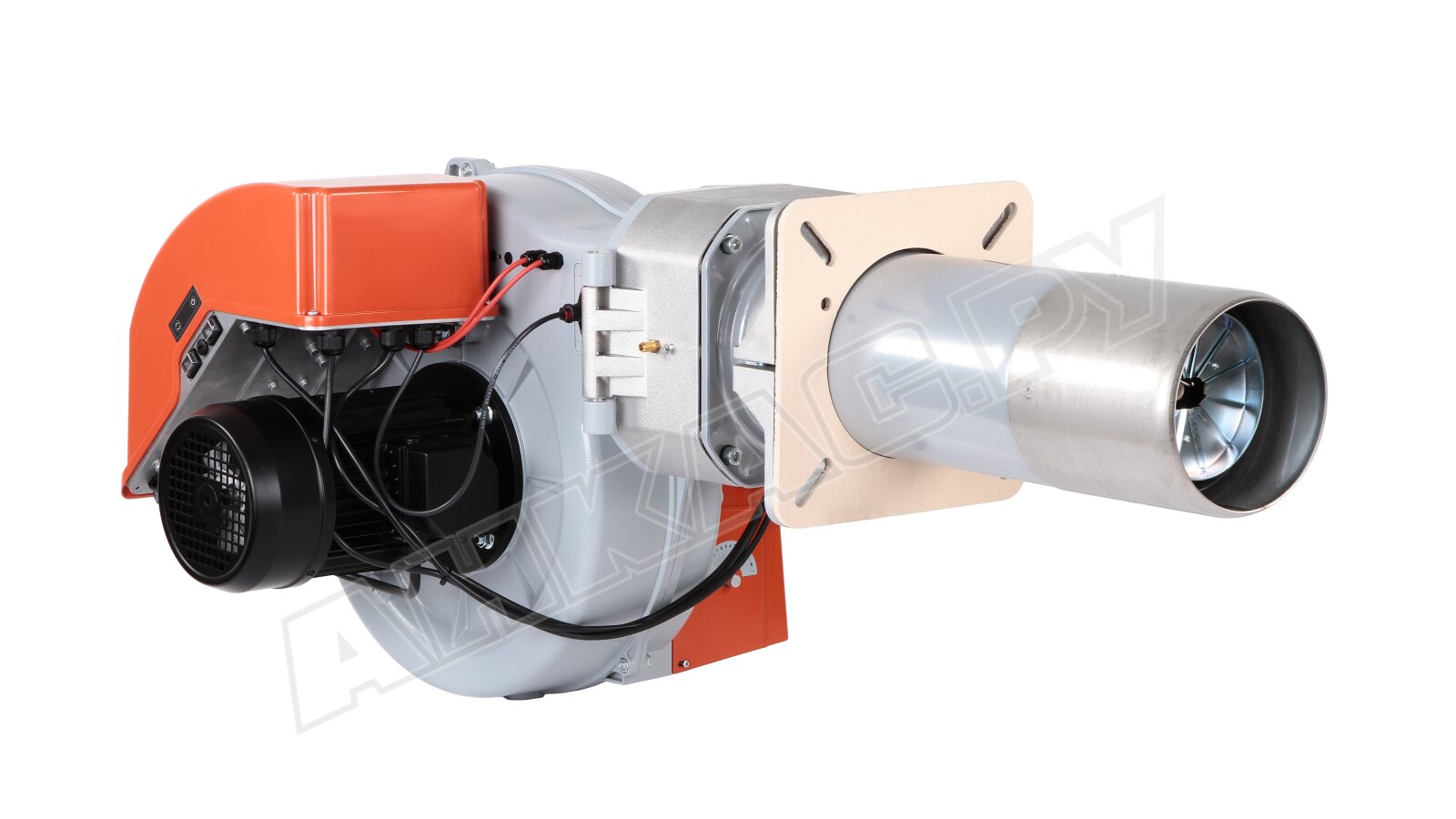 Горелка работает от 380-вольтового электродвигателя мощностью 2200 Вт, оснащена высокопроизводительным вентилятором с пониженным уровнем шума и потребляемой электрической мощностью 2800 Вт. Для оптимального распыления топлива используется форсунка, обеспечивающая высокое давление, а эффективное сжигание достигается за счет регулирования воздушной заслонки и головки. Воздухозаборник обеспечивает оптимальный воздушный поток при открытии заслонки, а регулирование объема воздуха на 1-й и 2-й ступенях осуществляется с помощью гидропривода. Контроль пламени осуществляется фоторезистивным датчиком, а поворотный шарнир обеспечивает удобство обслуживания блока распыливания без демонтажа.