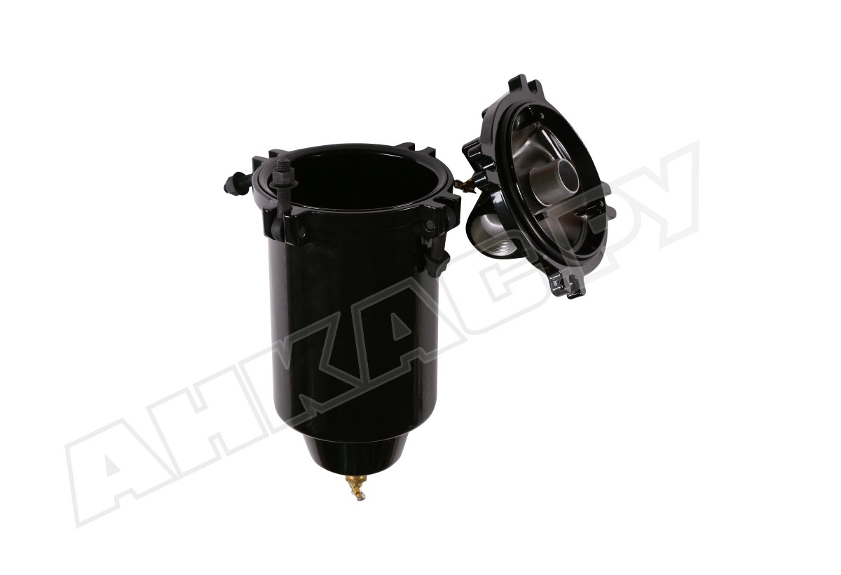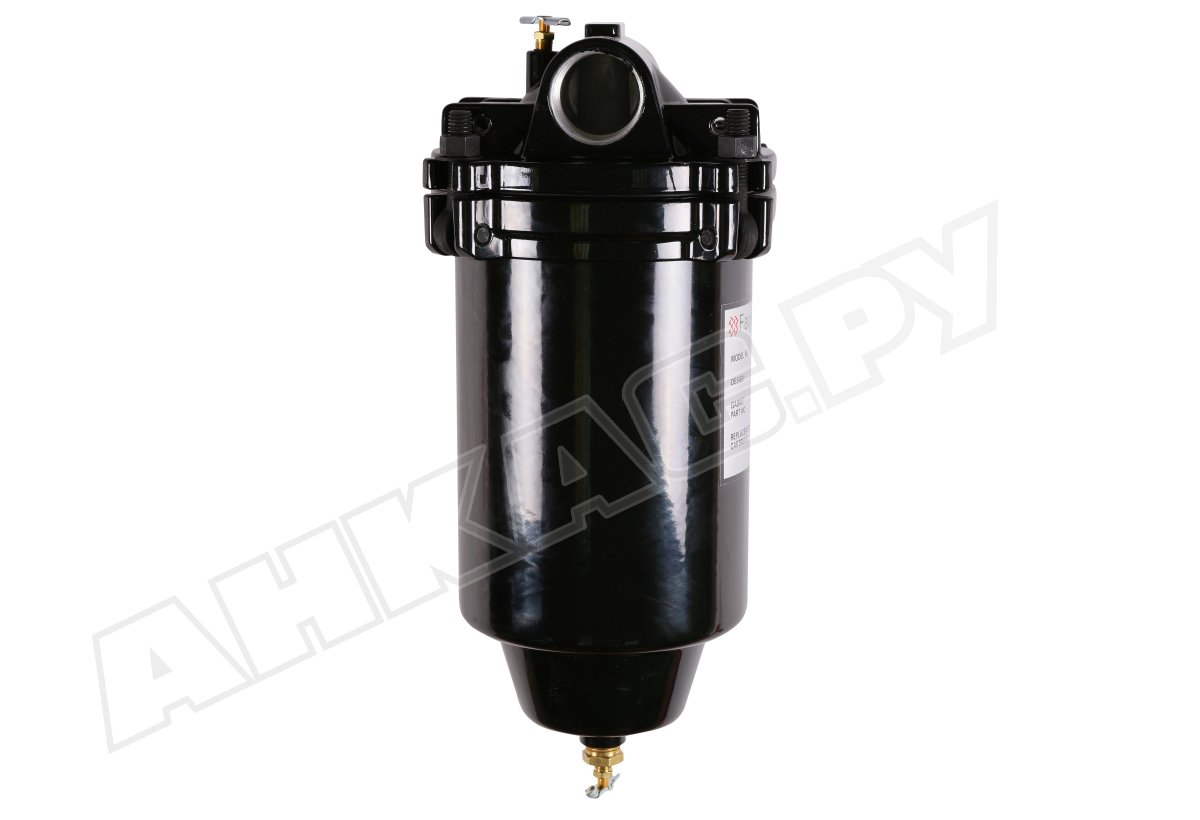 Корпус изготовлен из алюминия. Выходные отверстия резьбовые, диаметром 40 мм. Объем колбы – 10 литров. Специальный датчик загрязненности и клапан слива шлама значительно облегчают эксплуатацию и обслуживание.