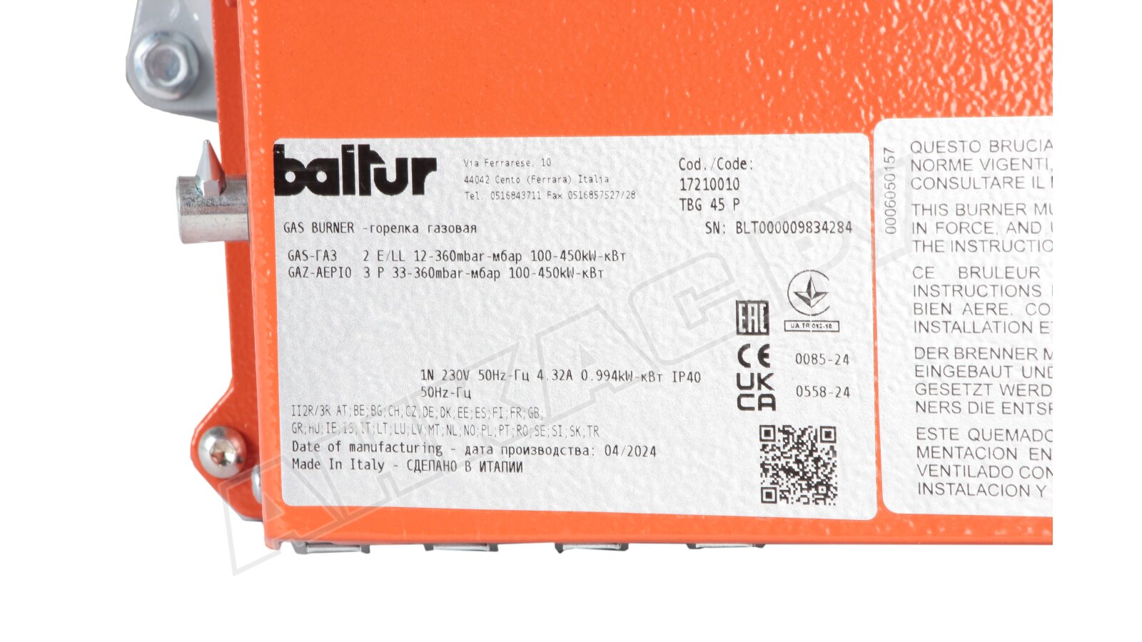 Газовая горелка Baltur TBG 45 P, арт: 17210010 – это надежное и эффективное решение для отопления, сочетающее в себе стабильную работу, безопасность и экологичность. Данная модель, произведенная в Италии, отличается высоким качеством исполнения и передовыми технологиями сжигания. Автоматизированная система управления обеспечивает оптимальное горение газовоздушной смеси, контролируя и регулируя все параметры для бесперебойной работы и максимальной экономичности. Мощность горелки может быть изменена в двухступенчатом режиме, от 100 до 450 кВт, что позволяет адаптировать ее под различные потребности и нагрузки.