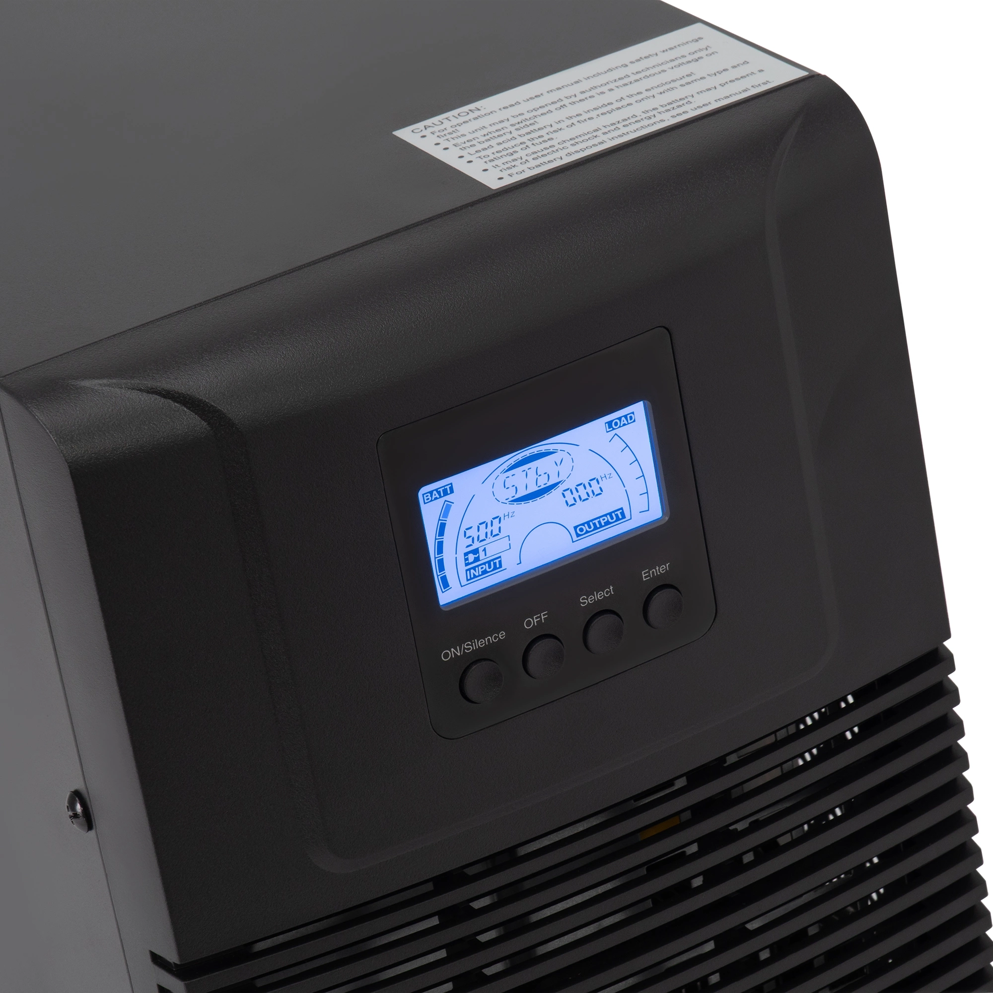На корпусе есть разъемы для подключения шнуров питания. Для связи с компьютером используются разъемы RS232 и USB Type B. На фронтальной панели предусмотрен ЖК-дисплей, на который выводится важная информация о состоянии ИБП и режиме, в котором он работает.