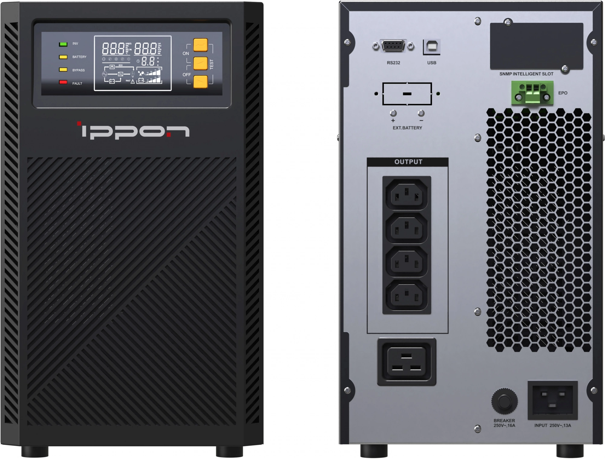 - Разъемы RS-232, USB-B для интеграции ИБП в существующие системы мониторинга и управления, обеспечивая гибкость и удобство использования