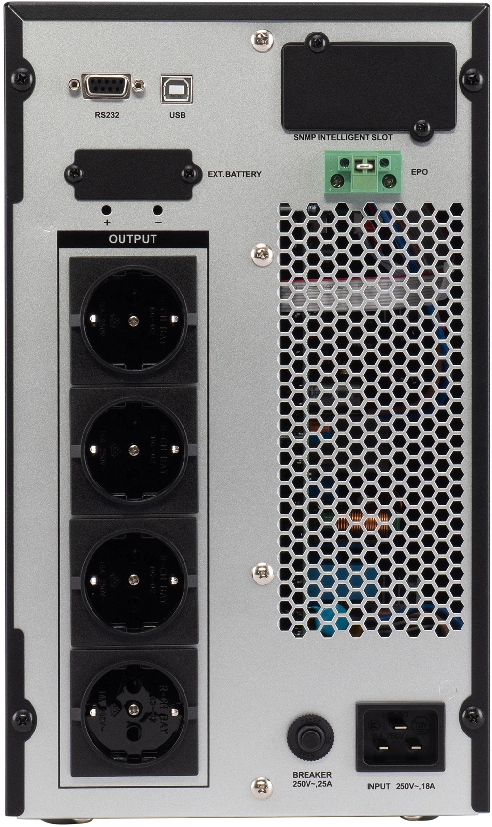 - Порт аварийного отключения питания (EPO) позволит экстренно отключить питание в случае пожара или аварии, обеспечивает безопасность персонала и защищает оборудование при чрезвычайных ситуациях
