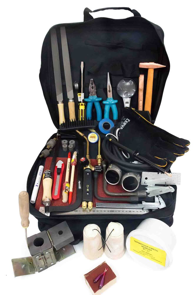 В комплект КСУ-ЭХЗ-1 входят термосмесь, одноразовая и многоразовая тигель-форма, термопатроны и термошашки, защитные очки сварщика, нож, лупа с подсветкой, изолированные плоскогубцы и тонкогубцы, электропаяльник, шаблоны сварщика, напильник, ножовка по металлу, зубило, штангенциркуль, горелка с рукавом, плавкий пруток.