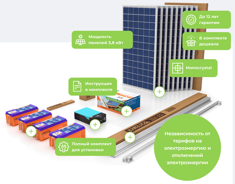 Комплект готовой солнечной электростанции – прекрасная альтернатива обычным генераторам, как автономным источникам электроэнергии. Его установку особенно рекомендуется проводить в загородных коттеджах и в собственных домах, удаленных от центральной сети электроснабжения.Благодаря автономной работе электростанция также поможет поддерживать работу электроприборов во времяаварийного или планового ремонта сети.