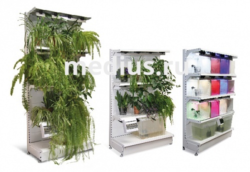 На полках размещены прозрачные пластиковые поддоны для осуществления программируемого или ручного полива горшков с грунтами и растениями, помещенных в данные поддоны.