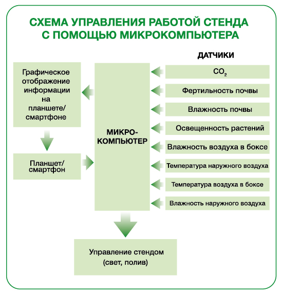 Управление работой микрокомпьютера комплекса производится дистанционно с помощью планшета или смартфона. Микрокомпьютер опрашивает датчики углекислого газа, фертильности почвы, влажности почвы, освещенности растений, влажности воздуха в боксе, температуры воздуха в боксе, температуры наружного воздуха, влажности наружного воздуха. Данные с датчиков обрабатываются микрокомпьютером, поступают на планшет в режиме реального времени и отображаются в виде графиков.