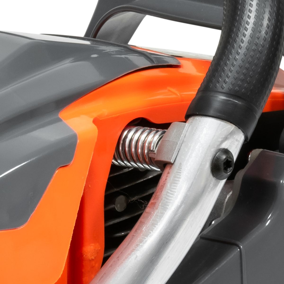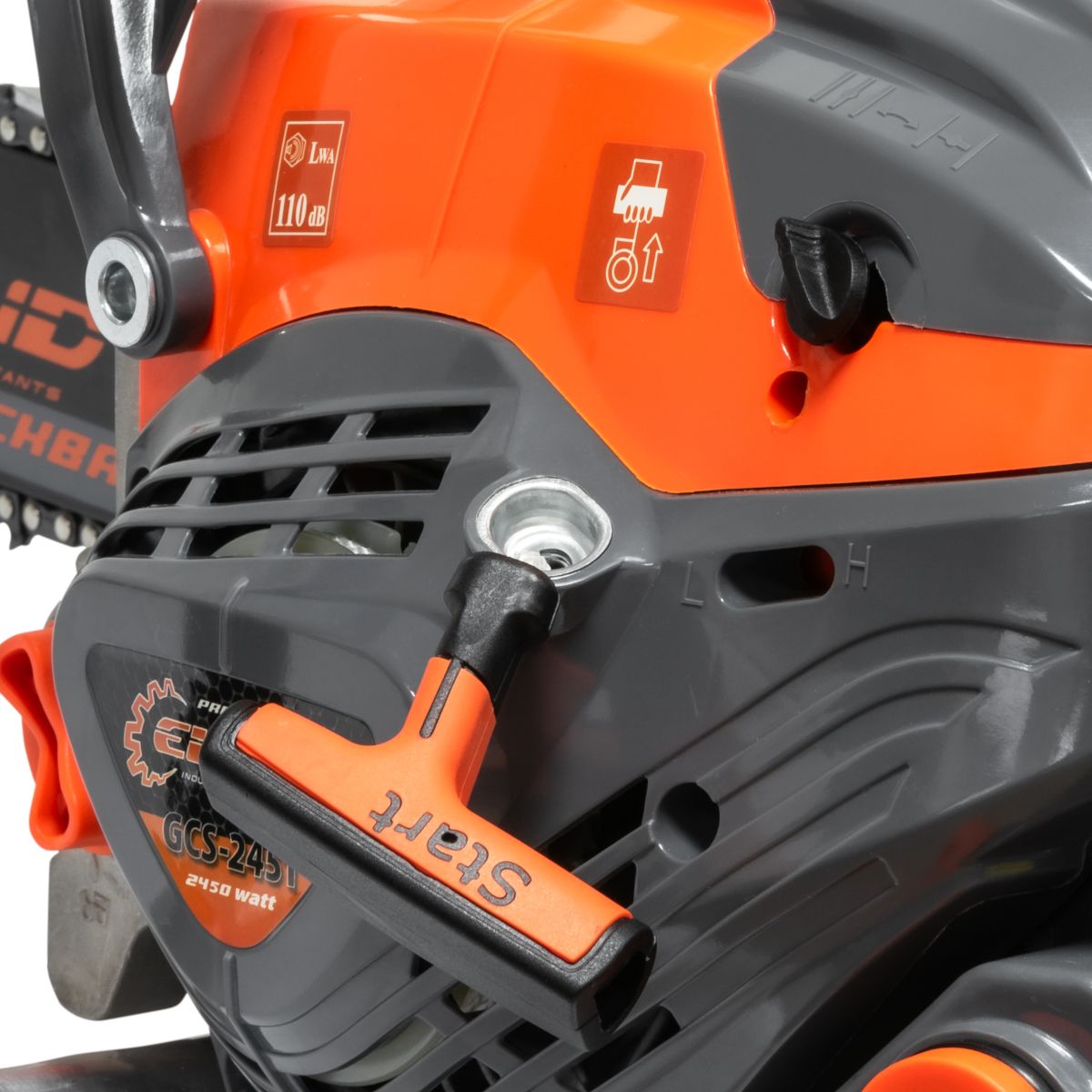 - Безопасность: Двухопорное крепление ручки тормоза обеспечивает моментальную остановку цепи, а металлический уловитель цепи предотвращает ее отскакивание.