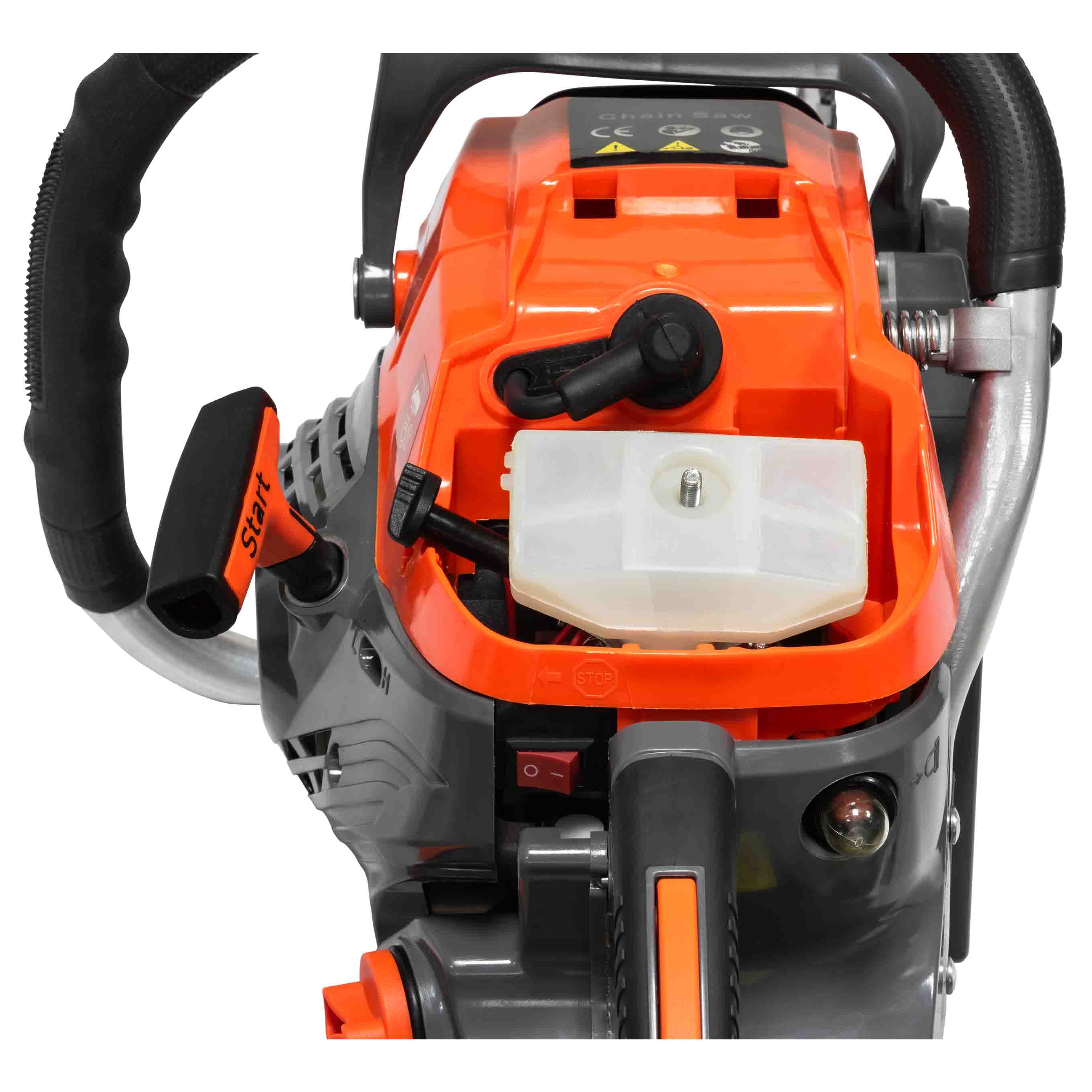 - Продуманные детали: Металлический упор для шнура стартера защищает его от повреждений, улучшенная система фильтрации воздуха продлевает срок службы двигателя, а система специальной фиксации свечного колпачка и широкие горловины для масла и топлива делают эксплуатацию пилы удобной и простой.