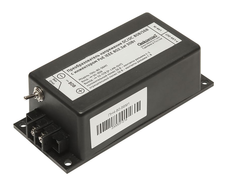 DC/DC Активный PoE-инжектор ПН4-80-56М1 (80 В/56 В), поддерживает стандарт IEEE 802.3at. Предназначен для питания по сети Ethernet точек доступа Wi-Fi, IP-видеокамер и других устройств, поддерживающих технологию PoE (Power over Ethernet – передача питания по витым парам сетевого кабеля). Для корректной работы преобразователя необходимо, чтобы подключаемое к нему устройство поддерживало стандарт IEEE 802.3at.