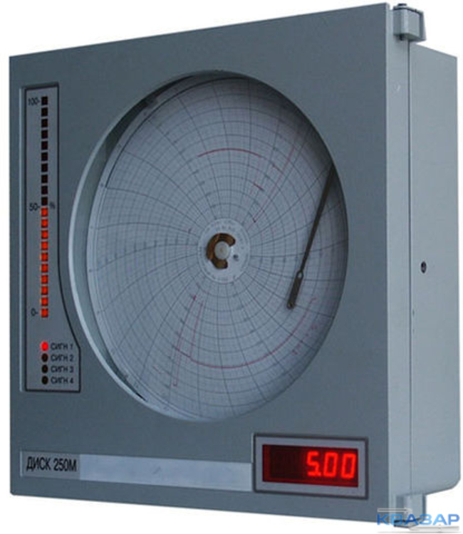 Приборы серии "ДИСК-250" имеют отлично видимую шкалу кругового типа и светодиодную индикацию состояний — включения прибора, обрыва датчика, выхода отслеживаемого параметра за пределы уставки. Линия регистрации процесса непрерывна на диаграммном диске.