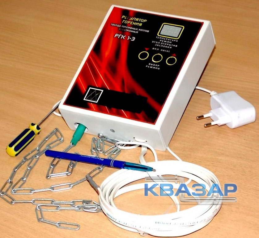 Регулятор горения твердотопливных котлов РГК 2-1 предназначен для контроля и регулирования температуры теплоносителя котлов с мощностями от 40 до 150 кВт с использованием управления вентилятором наддува воздуха и циркуляционным насосом системы отопления.