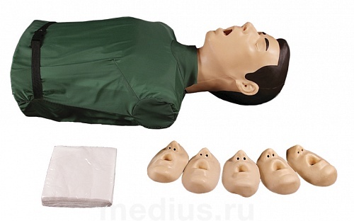 - анатомическая имитация век, полости рта: верхняя и нижняя челюсть с зубами, язык, нёбо, гортань, верхняя часть трахеи, нос с ноздрями и мягкими крыльями для прижатия к носовой перегородке в режиме «изо рта в рот»;