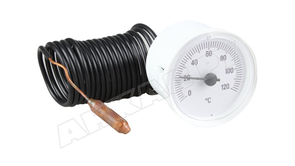 Термометр Beretta R105571 применяется в системах отопления для контроля температуры горячей воды в котле. Оснащен корпусом со шкалой разметки до +120 °С, капиллярной трубкой и измерительной головкой.Особенности и характеристики:диапазон измерений: 0…+120 °С;надежный, коррозиестойкий корпус;четкая, хорошо заметная шкала разметки с делениями и цифрами;нетребовательность в техобслуживании.Принцип работыКонтроль температуры рабочей среды осуществляется за счет расширения жидкости в капиллярной трубке. Под воздействием температуры объем жидкости изменяется, что создает усилие и перемещает стрелку шкалы термометра.