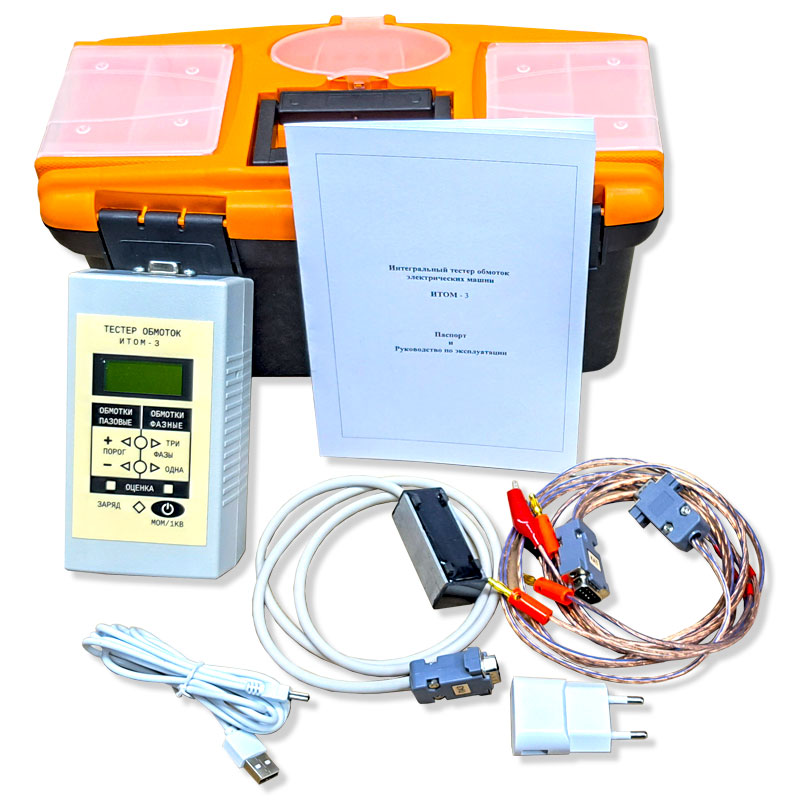 Интегральный тестер обмоток электрических машин трехфазный ИТОМ-3 предназначен для комплексной проверки состояния изоляции и различных дефектов в обмотках электрических машин с напряжением до 1000 В, а также для обслуживания и ремонта электрических машин и аппаратов. Тестер позволяет проверять наличие замкнутых витков обмотки статоров и роторов, уложенных в пазы или в катушках.