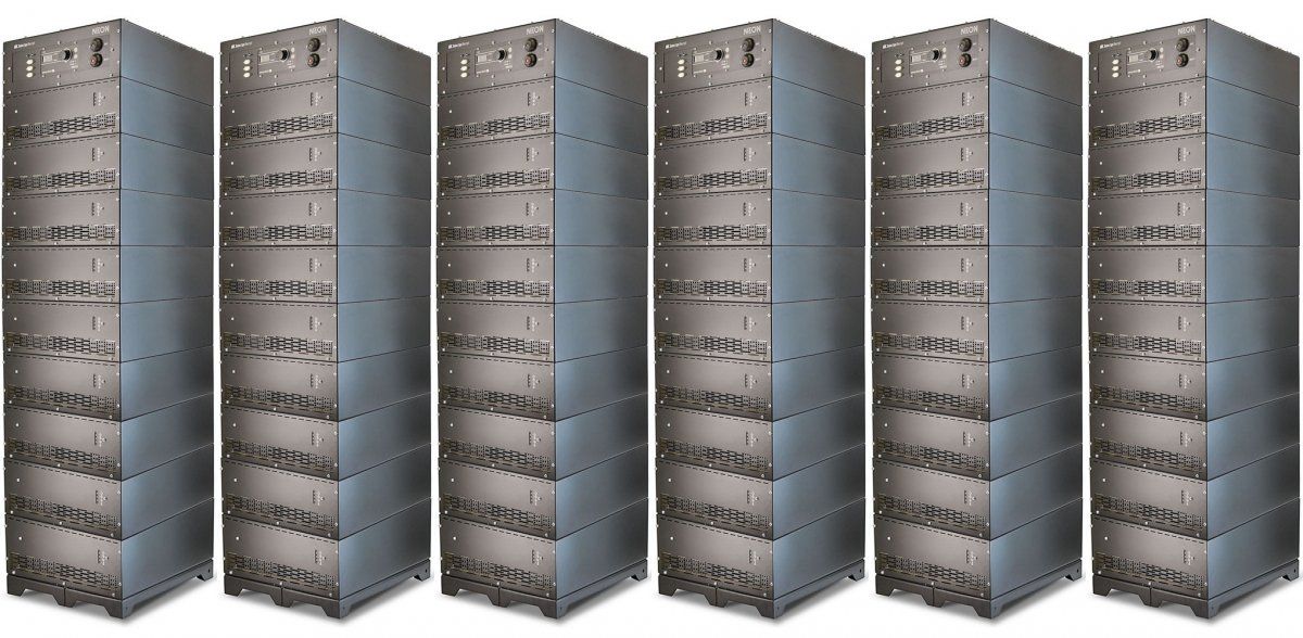 Выпрямительная система NEON ИПГ-60/6000-380 IP54 представляет собой 6 напольных блоков, выполненных на базе 54 выпрямительных модулей по 112 А и 6 модулей управления и коммутации. На передней панели блока размещены органы управления, индикации и интерфейсные разъемы, на задней — вентиляторы и коммутационные элементы для подключения сети и нагрузки.