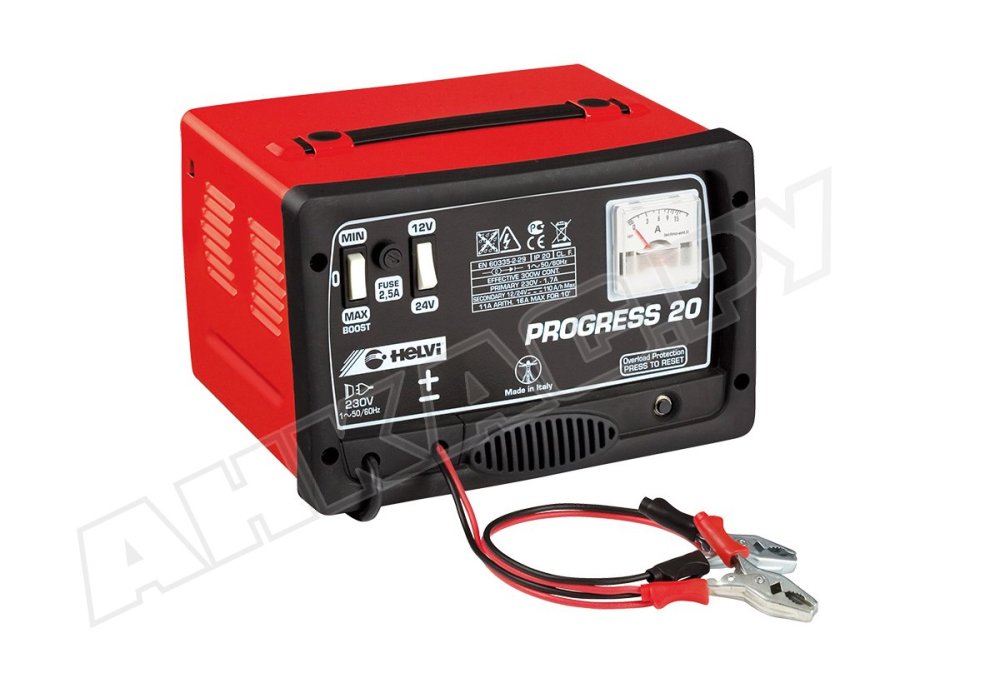 Итальянское зарядное устройство для автомобильного аккумулятора «ПРОГРЕСС 20» – это надежное решение для подзарядки свинцово-кислотных аккумуляторов легковых машин, легких грузовиков, тракторов и мототранспорта. Разработанное компанией Helvi, это компактный аппарат отличается высоким уровнем безопасности благодаря блоку электронной защиты от реверсивной полярности подключения и перегрева трансформатора.