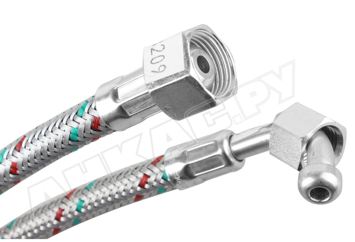 Шланг имеет два типа соединений: одно – угловое с внутренней резьбой (накидная гайка) для подключения к элементам системы, другое – прямое соединение с внутренней резьбой (накидная гайка) для удобства монтажа.
